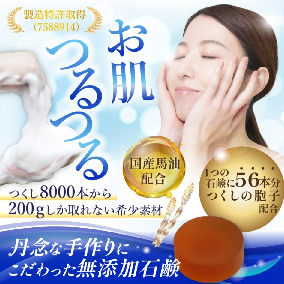 国産馬油配合!丹念な手作りにこだわった特許取得の無添加石鹸です(特許7588914)。